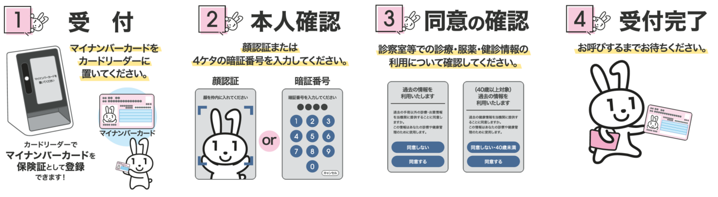 受診のたびカードリーダーで本人確認を行っていただく必要がありますので、毎回ご持参ください。